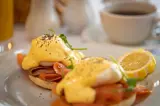 Toasted muffin topped with fresh smoked salmon, a poached egg and creamy hollandaise sauce