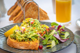 Seasoned avocado on white or brown toast, with bacon and poached egg.